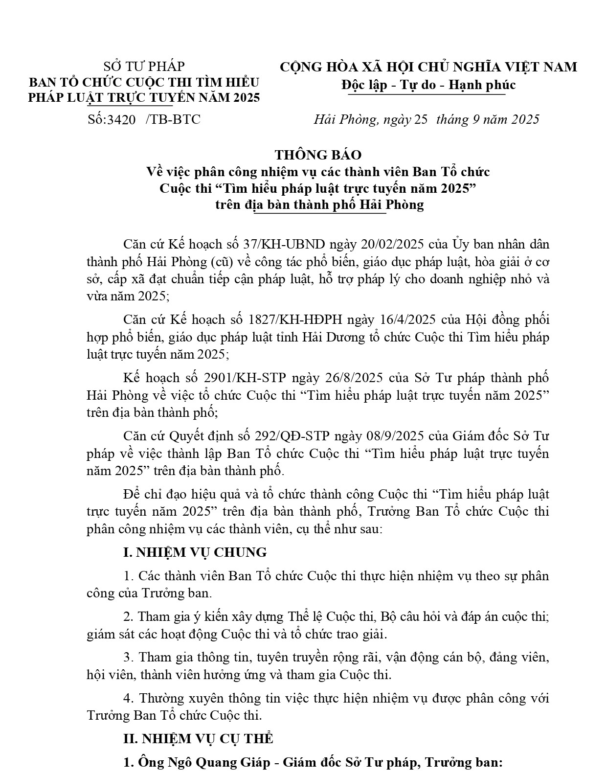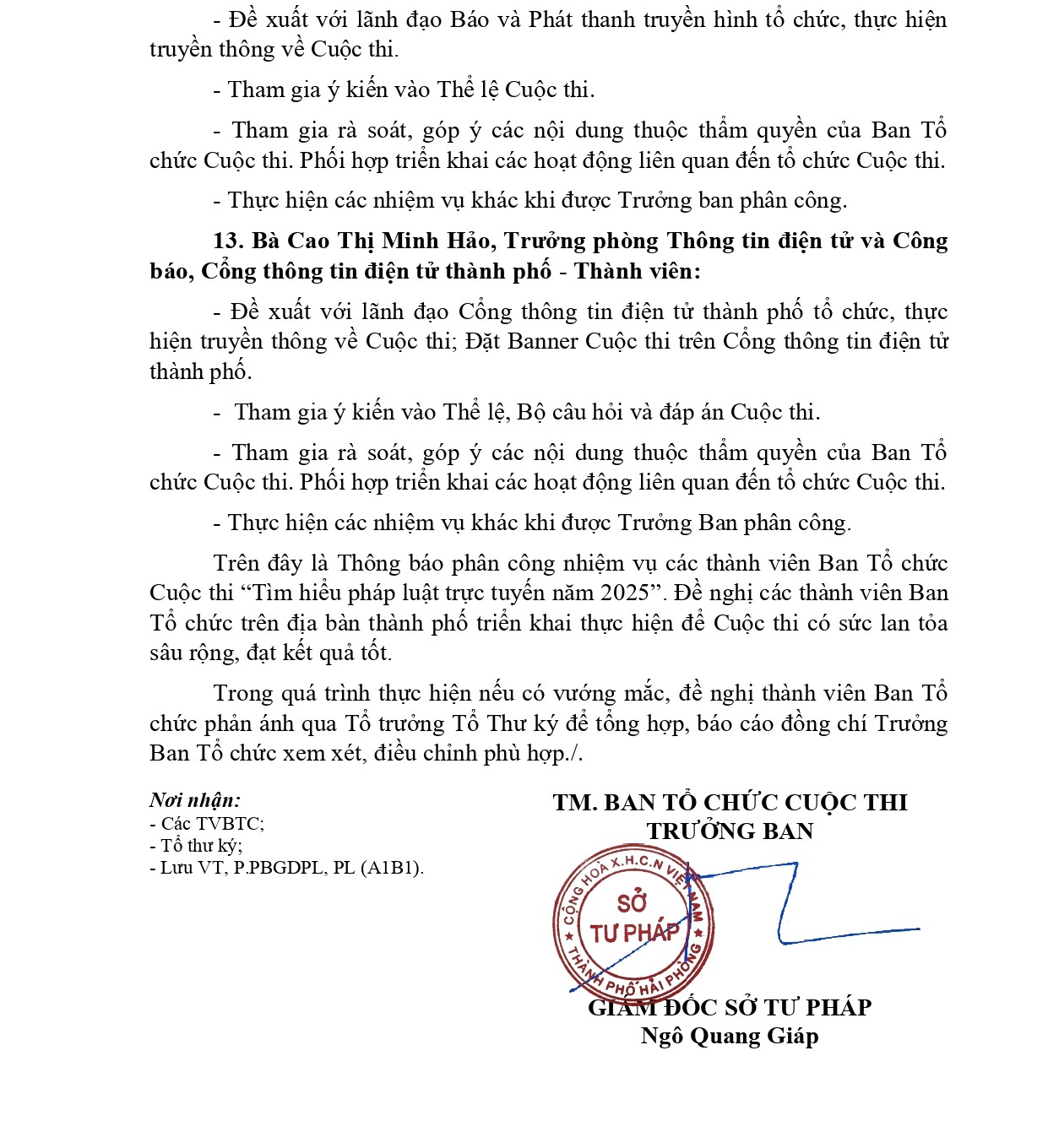 Thông báo phân công nhiệm vụ Ban Tổ chức